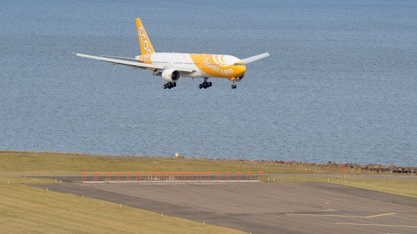In this handout image provided by SCOOT, SCOOT flight TZ2, Boeing 777, registration 9V-OTC lands from its inaugural Singapore to Sydney flight at Sydney International Airport on June 5, 2012 in Sydney, Australia.